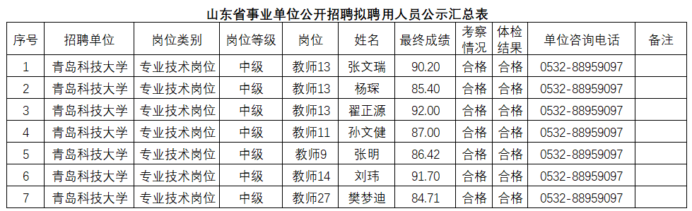 根据事业单位相关规定,按照岗位招聘计划,青岛科技大学组织完成了公开招聘考试、考察、体检等工作,现对拟聘用人员(名单附后)进行公示。