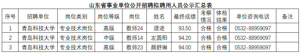 根据事业单位相关规定,按照岗位招聘计划,青岛科技大学组织完成了公开招聘考试、考察、体检等工作,现对拟聘用人员(名单附后)进行公示。
