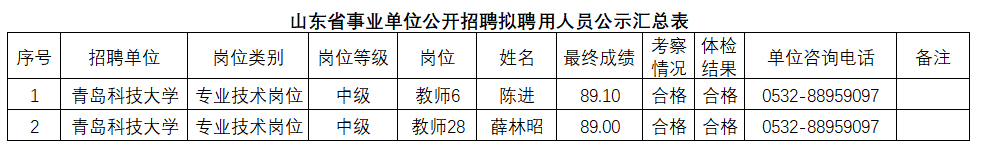 根据事业单位相关规定,按照岗位招聘计划,青岛科技大学组织完成了公开招聘考试、考察、体检等工作,现对拟聘用人员(名单附后)进行公示。