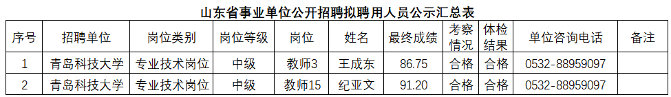 根据事业单位相关规定,按照岗位招聘计划,青岛科技大学组织完成了公开招聘考试、考察、体检等工作,现对拟聘用人员(名单附后)进行公示。